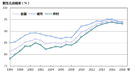 加強新生兒訪視。指導家長做好新生兒喂養、護理和疾病預防,早期發現異常和疾病,及時處理和就診,新生兒訪視率穩步提高,從1996年的81.4%提高到2018年的93.7%,城鄉差距不斷縮小(圖14)。