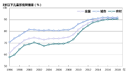 圖15 1996—2018年城鄉3歲以下兒童系統管理率變化趨勢