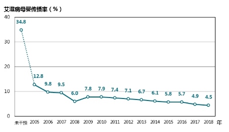 全力預防艾滋病、梅毒、乙肝母嬰傳播。為全國孕產婦免費提供艾滋病、梅毒、乙肝篩查,為所有發現感染的孕產婦及所生兒童提供預防母嬰傳播綜合干預服務。近年來,孕產婦艾滋病、梅毒和乙肝的檢測率穩定在99%以上,艾滋病母嬰傳播率從干預前的34.8%下降到2018年的4.5%(圖9),先天梅毒報告病例數下降幅度超過70%,乙肝感染孕產婦所生兒童的乙肝免疫球蛋白注射率達到99.7%,有效避免和減少了兒童新發感染。