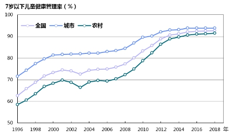 圖16 1996—2018年城鄉7歲以下兒童健康管理率變化趨勢