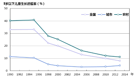 中國5歲以下兒童生長遲緩率持續下降。2013年中國5歲以下兒童生長遲緩率為8.1%,與1990年的33.1%相比下降了75.5%。
