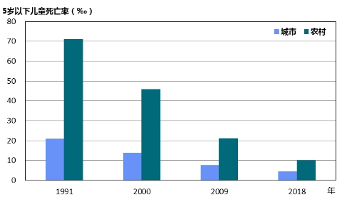 城鄉差距明顯縮小。2018年農村和城市5歲以下兒童死亡率分別為10.2‰和4.4‰,比1991年分別下降了85.7%和78.9%。1991年城鄉5歲以下兒童死亡率之比為1:3.4,2018年縮小到1:2.3(圖5)。