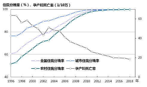 圖10 1996—2018年全國城鄉住院分娩率與孕產婦死亡率變化趨勢