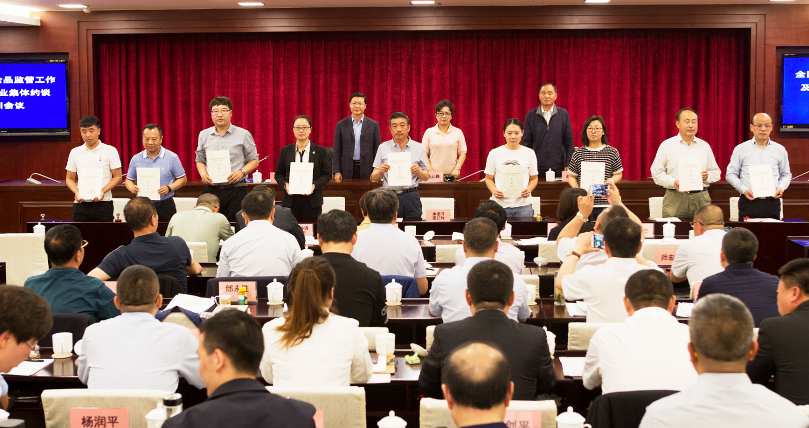 圖為內(nèi)蒙古自治區(qū)市場(chǎng)監(jiān)督管理局召開(kāi)特殊食品監(jiān)管工作及生產(chǎn)企業(yè)集體約談培訓(xùn)會(huì)上 企業(yè)代表簽訂承諾書(shū)后合影。楊燕/攝