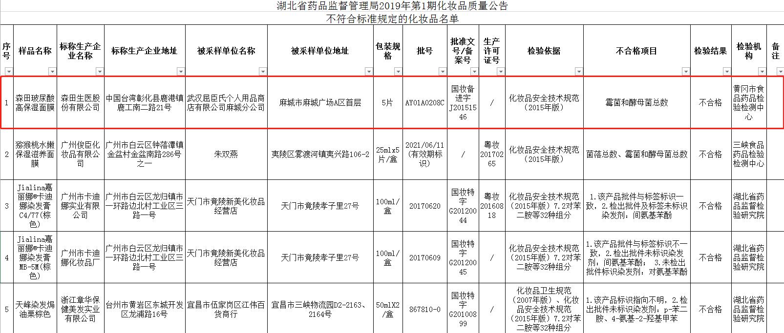這款森田面膜湖北停售!霉菌、酵母菌總數再次被檢不合格