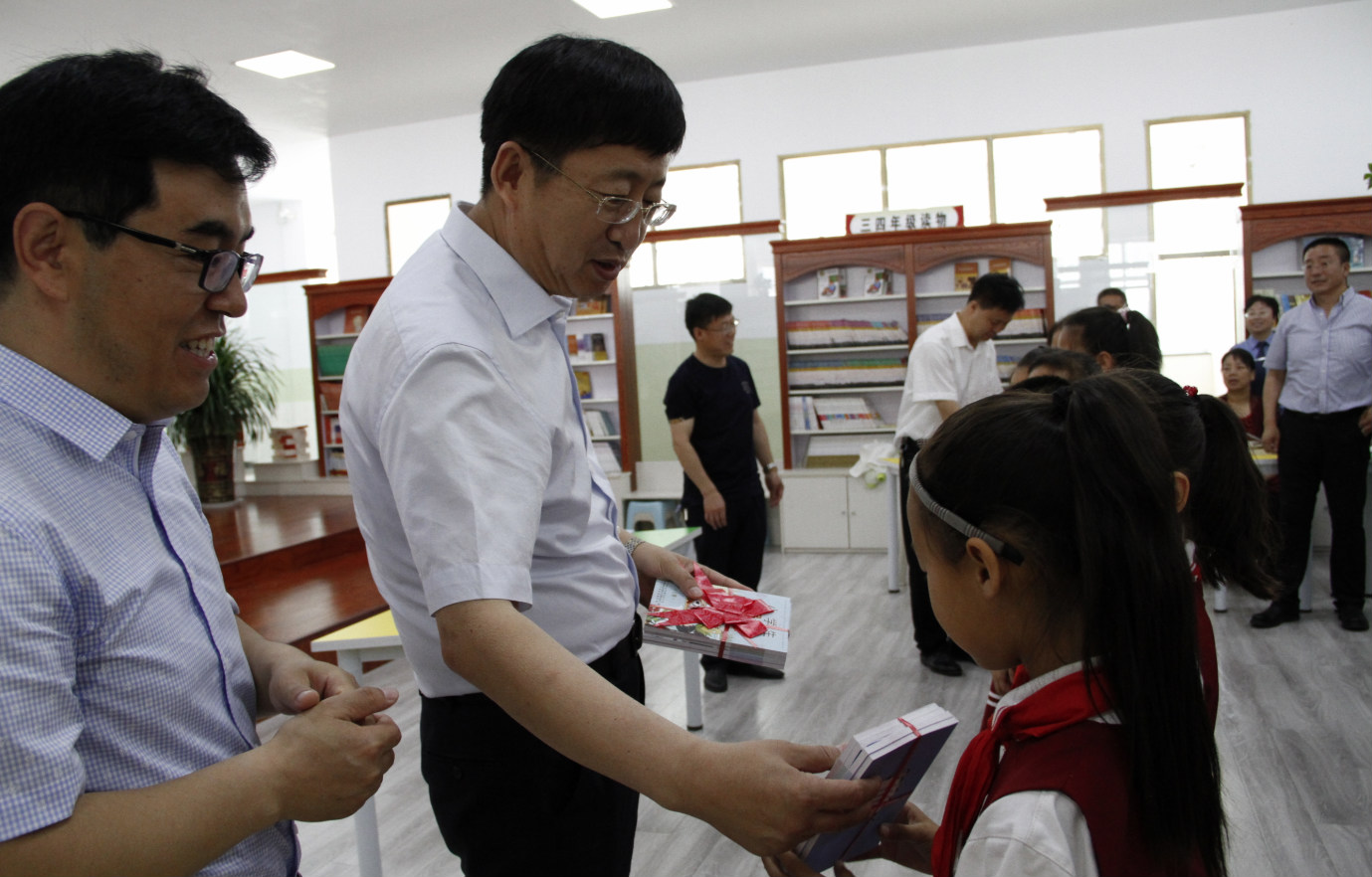 圖為晉中市食安辦主任、市市場監督管理局黨組書記、局長曹治勝(左二)在左權縣宏遠學校向學生免費發放食品安全知識科普讀本。