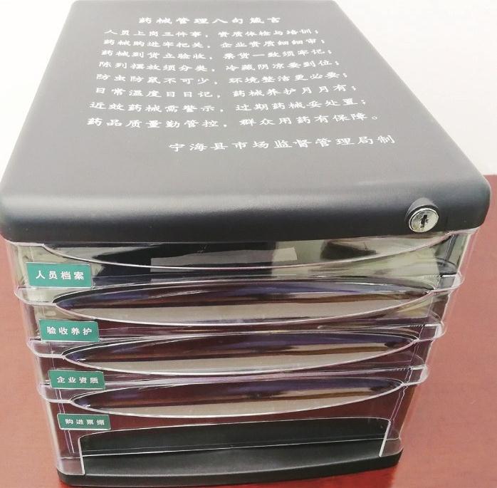 這個盒子就是寧海縣市場監(jiān)管局藥械監(jiān)管所制作的藥械管理“八句箴言”臺賬盒。該所針對城鄉(xiāng)接合部和農(nóng)村地區(qū)醫(yī)療機構(gòu)低、小、散,診所工作人員素質(zhì)參差不齊,實際負責人與登記人員不一致,診所管理模式不統(tǒng)一,配套設(shè)施不全等問題,提煉出藥械管理“八句箴言”:人員上崗三件事,資質(zhì)體檢與培訓(xùn);藥械購進牢把關(guān),企業(yè)資質(zhì)細細審;藥械到貨立驗收,票貨一致須牢記;陳列擺放須分類,冷藏陰涼要到位;防蟲防鼠不可少,環(huán)境整潔更必要;日常溫度日日記,藥械養(yǎng)護月月有;近效藥械需警示,過期藥械妥處置;藥品質(zhì)量勤管控,群眾用藥有保障。