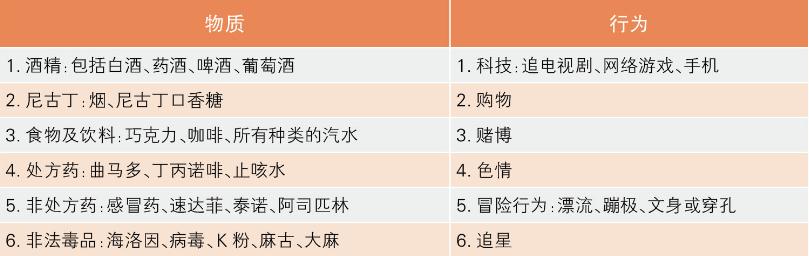 美國著名的治療成癮的心理治療師弗雷德里克·沃爾夫頓在其著作中總結了其在多年的成癮心理治療工作中見到的、常被濫用的物質及行為(詳見下表),這些在我們國內的成癮治療工作也經常碰到。