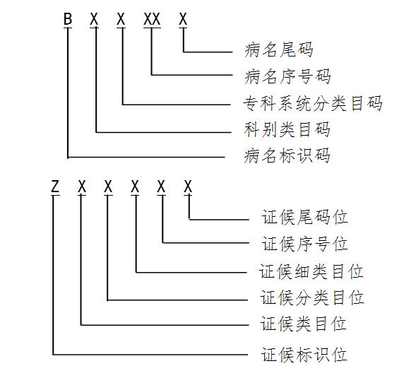 中醫診斷編碼使用“95國標”,包含中醫病名和中醫證候名編碼,均為由阿拉伯數字和大寫英文字母組成的6位碼。中醫病名和證候名編碼結構見圖3。