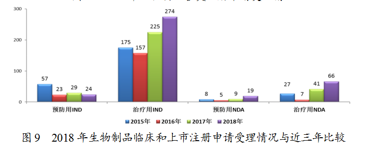 藥審中心受理1類生物制品創新藥注冊申請123件(包括預防用生物制品6件,治療用生物制品117件),較2017年增長了62%。其中,受理1類生物制品NDA 11件(包括預防用生物制品2件,治療用生物制品9件,共涉及9個品種),較2017年增長了4.5倍;受理1類生物制品IND 112件(包括預防用生物制品4件,治療用生物制品108件,共涉及97個品種),較2017年增長了51%。