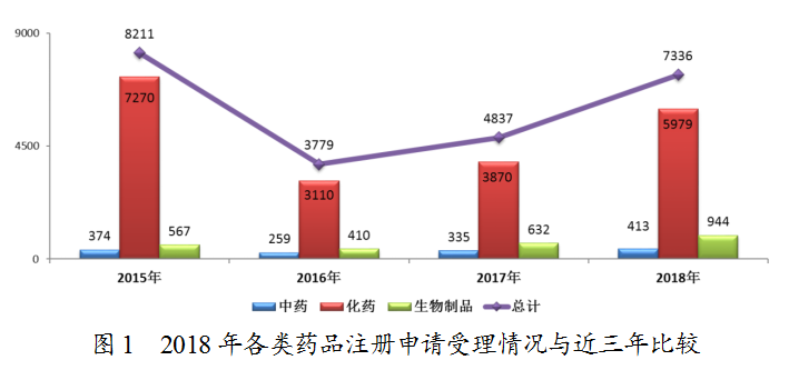 2018年,藥審中心受理的7336件新注冊申請中,化藥注冊申請受理量為5979件,占2018年全部注冊申請受理量的82%,2018年各類藥品注冊申請受理情況與近三年比較詳見圖1。