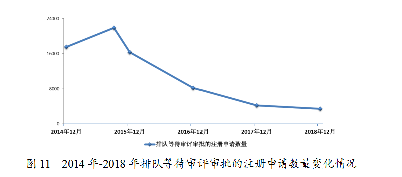 2018年底排隊等待審評審批的注冊申請已由2015年9月高峰時的近22000件降至3440件(不含完成審評因申報資料缺陷等待申請人回復補充資料的注冊申請),進一步鞏固了44號文件要求解決注冊申請積壓的成效。2014年-2018年排隊等待審評審批的注冊申請數量變化情況詳見圖11。