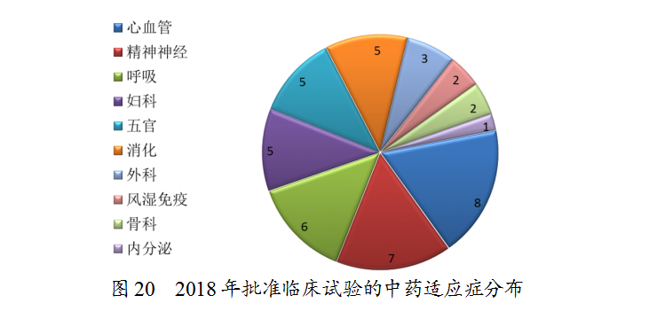藥審中心審評通過批準臨床試驗的中藥IND申請44件,涉及10個適應癥領域,其中心血管、精神神經、呼吸較多,共占48%,具體治療領域分布詳見圖20。