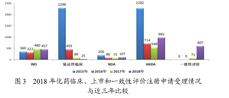藥審中心受理化藥注冊申請共5979件,其中受理化藥NDA申請107件,較2017年增長了43%;受理仿制藥上市申請(ANDA)982件,較2017年增長了79%。化藥各類注冊申請受理情況詳見圖2。2018年化藥臨床、上市和一致性評價注冊申請受理情況與近三年比較詳見圖3。