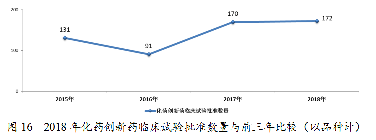 藥審中心完成審評的化藥IND申請603件,審評通過批準IND申請554件,其中批準1類創新藥臨床試驗申請449件(涉及172個品種)。1類化藥創新藥臨床試驗批準數量與前三年比較(以品種計)詳見圖16。
