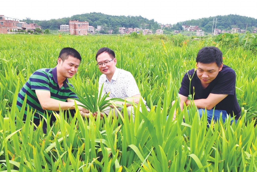 圖為7月8日,于都縣市場監管局駐新陂鄉廟背村第一書記肖桂(左一)在村里的射干種植基地了解藥材生長情況。王雨林 曾祥軍 攝影報道