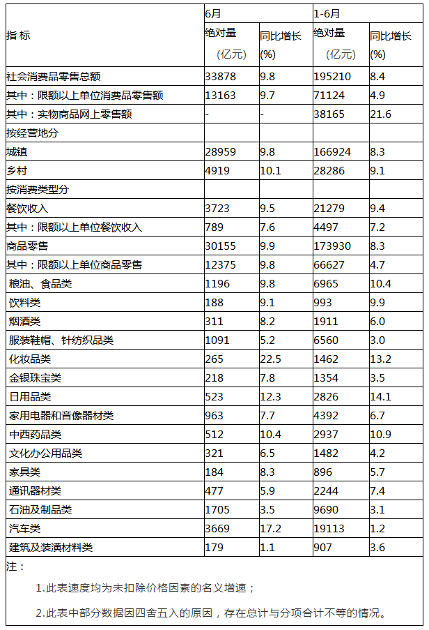 2019年上半年,社會消費品零售總額195210億元,同比名義增長8.4%(扣除價格因素實際增長6.7%,以下除特殊說明外均為名義增長)。其中,6月份社會消費品零售總額33878億元,同比增長9.8%。