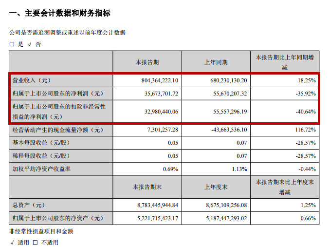 中國(guó)食品藥品網(wǎng)訊(記者 郭婷) 近日,廣東太安堂藥業(yè)股份有限公司(002433.SZ,以下簡(jiǎn)稱太安堂)發(fā)布了2019年第一季度報(bào)告:2019年1~3月,其營(yíng)業(yè)收入8.04億元,同比增長(zhǎng)18.25%;歸屬于上市公司股東的凈利潤(rùn)3567.37萬(wàn)元,同比下降35.92%;歸屬于上市公司股東的扣除非經(jīng)常性損益的凈利潤(rùn)3298.04萬(wàn)元,同比下降40.64%。