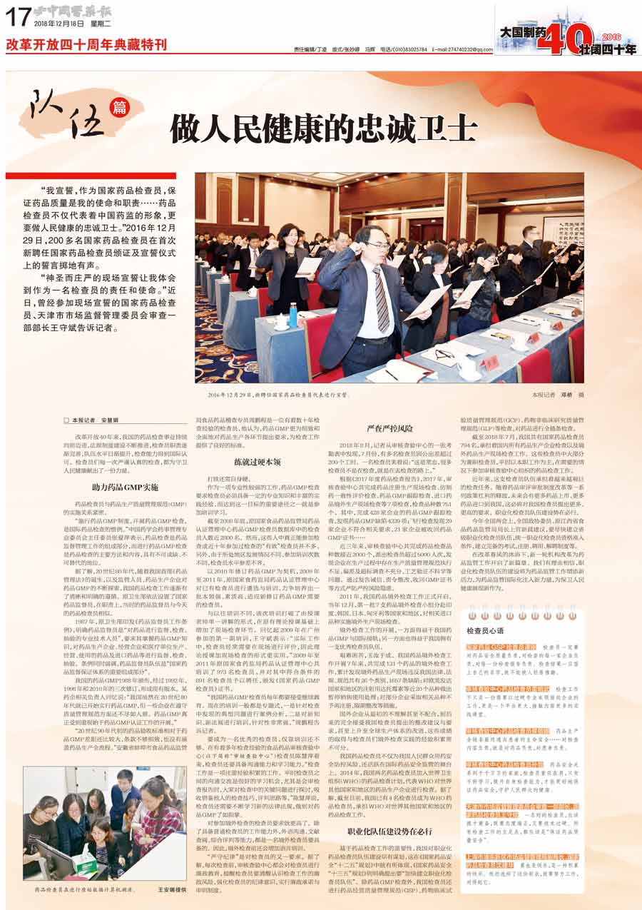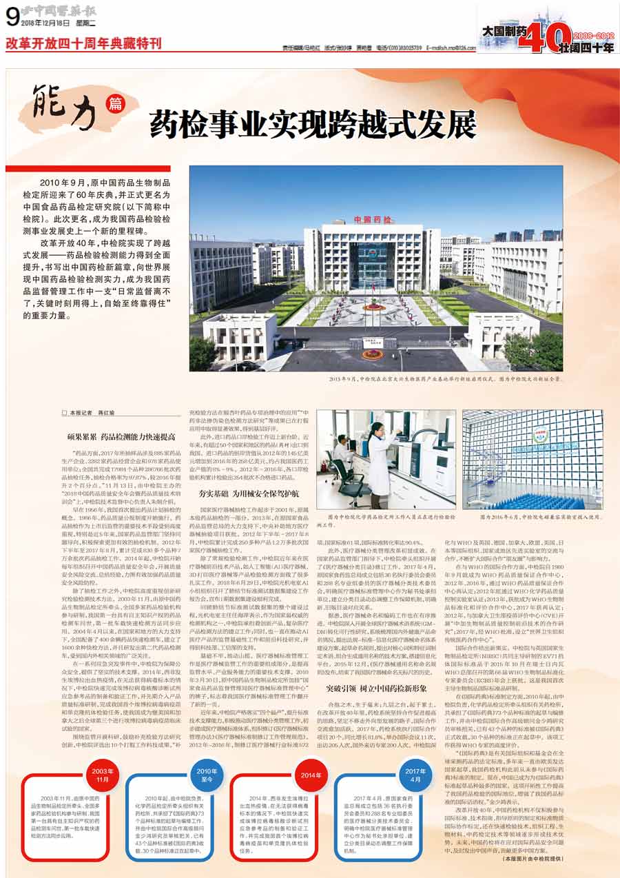 改革開放40年,中檢院實現了跨越式發展——藥品檢驗檢測能力得到全面提升,書寫出中國藥檢新篇章,向世界展現中國藥品檢驗檢測實力,成為我國藥品監督管理工作中一支"日常監督離不了,關鍵時刻用得上,自始至終靠得住"的重要力量。