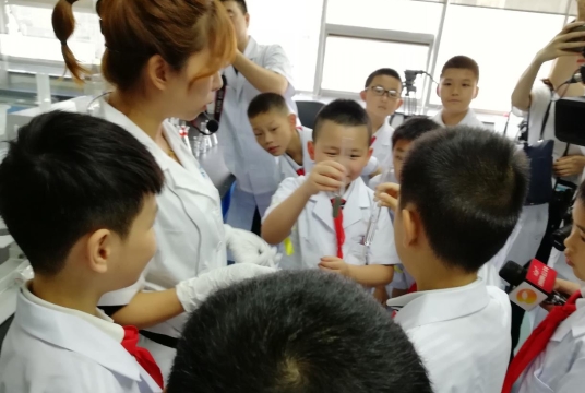 “阿姨,玻尿酸里面有尿嗎?”“大人服用的藥品可以給小朋友服用嗎?”……一群天真的孩子圍在講解員邱婧周圍爭先恐后地問個不停。